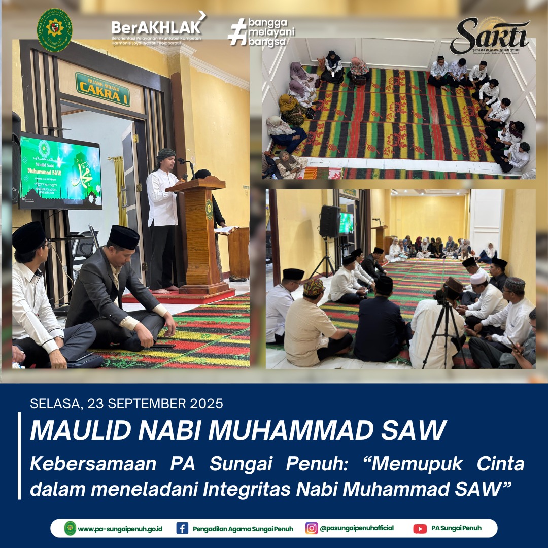 Dalam rangka memperingati Maulid Nabi Muhammad SAW 1447 H, Pengadilan Agama Sungai Penuh telah mengadakan kegiatan keagamaan sebagai momentum untuk meneladani akhlak mulia Rasulullah dalam kehidupan sehari-hari, khususnya dalam menjalankan tugas sebagai abdi negara.